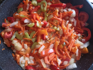В сковородку налейте около 3-4 ст.л. растительного масла. Отправьте лук, морковку и перец обжариваться. Готовьте на сильном огне, помешивая, около 5-8 минут.