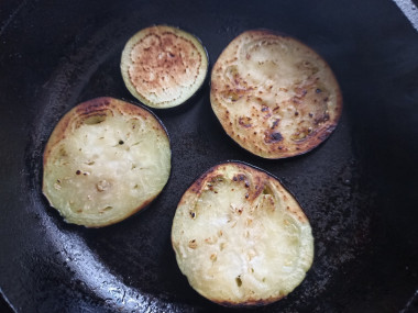 С баклажанов слейте жидкость и слегка отожмите кружочки. В сковороде разогрейте небольшое количество растительного рафинированного масла. Обжарьте баклажаны с двух сторон до золотистого оттенка. Выложите синенькие на бумажные салфетки, чтобы избавиться от лишнего жира.
