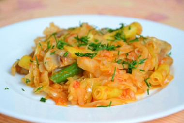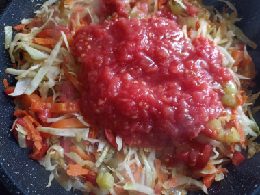Отправьте к зажарке капусту. Так же помешивая, готовьте около 5 минут.