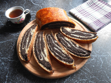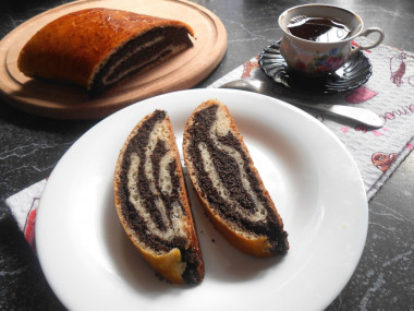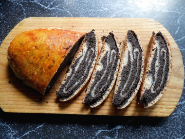 Выньте наш сдобный маковый рулет из духовки, накройте его полотенцем и дайте ему полностью остыть. Затем нарежьте рулет с маком из дрожжевого теста и подавайте на стол.