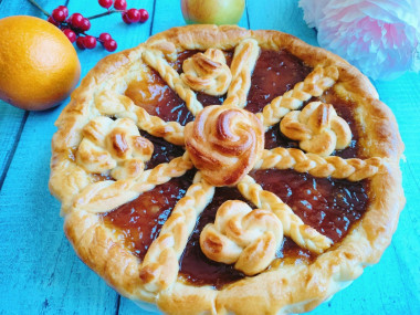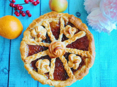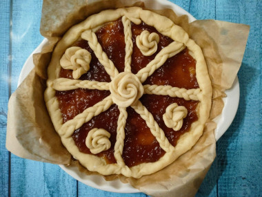, всё приходит с опытом. Верх пирога смазала смесью яйца и сметаны. Выпекала в своей духовке при 180 градусах 20 минут. Пирог вышел изумительно вкусным! Тесто нежное и мягкое! Повидло нигде не убежало. Я и моя семья в восторге! Обязательно буду печь такие пироги ещё, экспериментировать с начинками и украшениями
