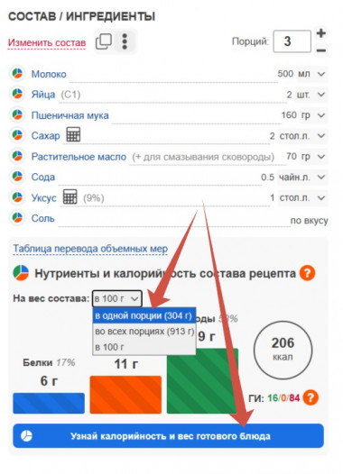 Кстати, на нашем сайте иногда удобнее ориентироваться не на количество, а на порции в граммах, смотря какой рецепт (например, супа). На скриншоте показала, где можно посмотреть, сколько грамм блюда в одной порции — возможно, эта информация пригодится вам в других рецептах. Только вот вес ингредиентов указан до начала готовки, и после приготовления он может измениться, так как размер яиц, количество муки и молока могут варьироваться. Если вы также захотите узнать калорийность готового блюда, учтите, что изначально указаны граммы и калорийность сырых продуктов. Для этого можно воспользоваться кнопкой «Узнай калорийность и вес готового блюда».