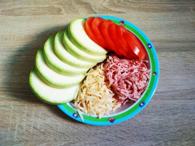 Как запечь кабачки с колбасой, сыром и помидорами в духовке? Подготовьте для этого все необходимое. Кабачки и помидоры хорошо промойте от загрязнений. Сыр берите любой, но чтобы он хорошо терся на терке.