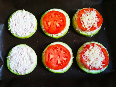 Помидоры нарежьте кружочками и разложите на кабачки. А на помидоры посыпьте тертый сыр. Поставьте форму в духовку, разогретую до 180 градусов, на 30-40 минут. При запекании ориентируйтесь по своей духовке. Из кабачков появится некоторое количество сока, который при запекании почти весь испарится. Сами кабачки станут мягче. Сыр расплавится и немного подрумянится.