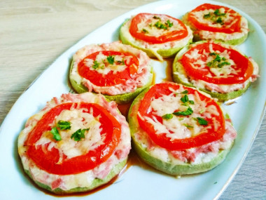 Кабачки с колбасой и сыром с помидорами в духовке - "нарядное" и очень вкусное блюдо. Особенно хорошо то, что для него подходят огромные зрелые кабачки и большие помидоры, как раз такие овощи у меня имелись в наличии. Только вместо майонеза я использовала сметану, смешанную с пропущенным через пресс зубчиком чеснока. Запекала в духовке минут 15. Получились такие большие кабачковые бутерброды, очень вкусные. Рецепт отличный, подойдет даже на праздничный стол. Спасибо!