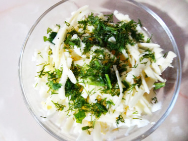 Взяла все необходимые продукты. В начинку добавила немного майонеза и много резанной петрушки и укропа.