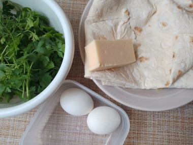 Как сделать бутерброды из лаваша с сыром на сковороде? Подготовьте указанные ингредиенты. Лаваш нужен тонкий. Сыр можно взять любой по вкусу. Я беру свежую зелень укропа, но можно взять петрушку или смесь петрушки и укропа. Яйца предварительно отварите: вымойте яйца, поместите в холодную воду, поставьте емкость на огонь и варите при умеренном кипении около 10 минут, затем яйца охладите в холодной воде.