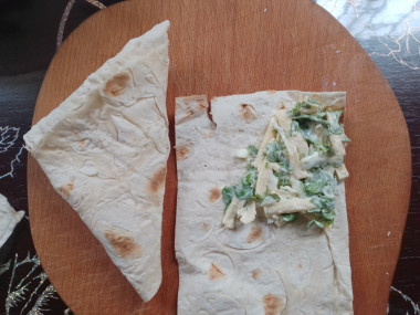 Подогните край лаваша, образуя треугольник. Сворачивайте по всей длине лаваш в виде треугольника, спрячьте начинку в лаваше.