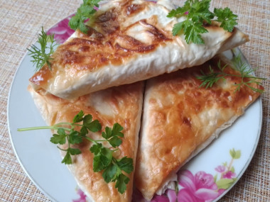 Выкладывала начинку на длинный пласт лаваша и заворачивала в треугольник. Делала так впервые и оказалось, что это просто)
