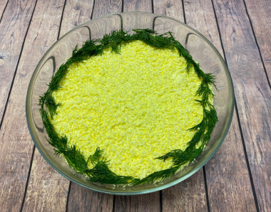 Возьмите отделенные в самом начале желтки и натрите их на терке, затем аккуратно распределите по всей поверхности салата, этот слой будет завершающим. Аккуратно снимите разъемную форму, украсьте салат по своему вкусу, я использовала для украшения свежие помидоры и укроп. Дайте настояться блюду в холодильнике в течение часа, затем можете подавать салат к столу. Приятного аппетита!
