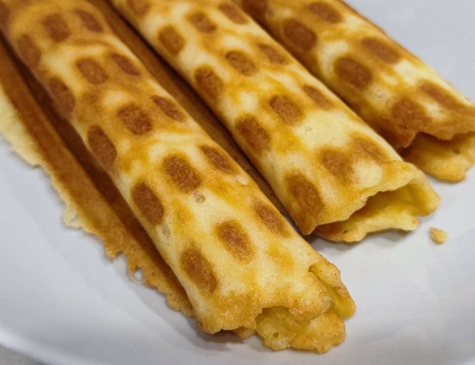 Еще горячий блинчик сверните трубочкой. Так же выпекайте остальные вафли, пока не закончится тесто. Готово!