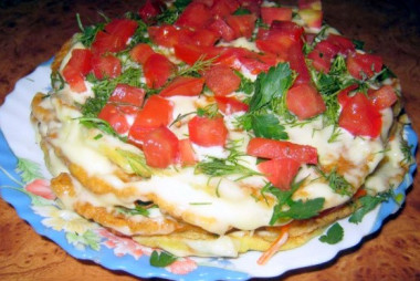 Можно приступать к сборке тортика. На плоскую тарелку подходящего размера выложите блинчик, смажьте его майонезом и распределите зажарку из моркови и лука. Сверху выложите следующий блинчик и опять смажьте майонезом и положите зажарку. Соберите таким образом весь торт. Последний блинчик смажьте майонезом и украсьте помидорами и зеленью. Кабачковый тортик готов. Приятного аппетита!