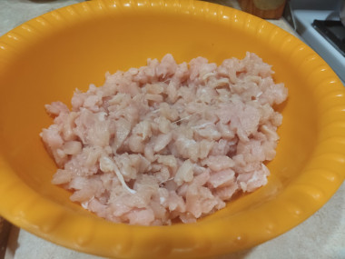 Куриное филе вымойте, обсушите бумажными полотенцами, срежьте пленочки и лишний жирок и очень мелко нарежьте, как если бы вы рубили мясо на хинкали или люля-кебаб.