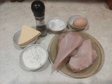 Калорийность продуктов: Куриное филе, Майонез, Пшеничная мука, Яйца, Твёрдый сыр, Перец, Соль, Растительное масло
