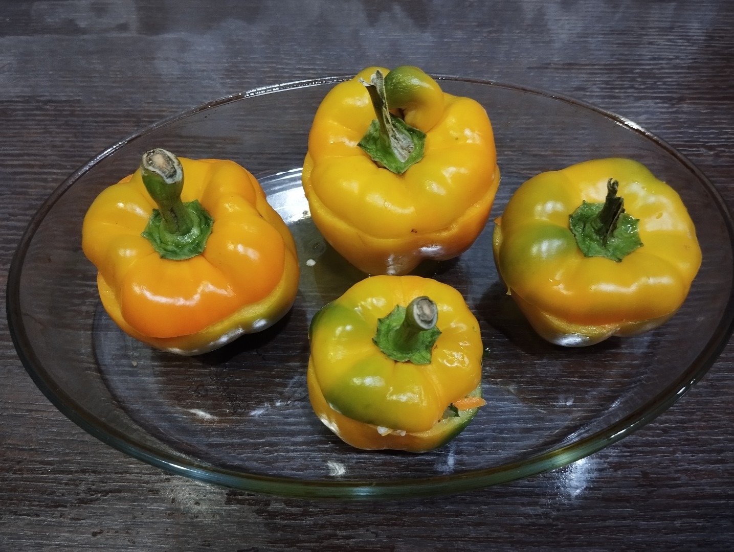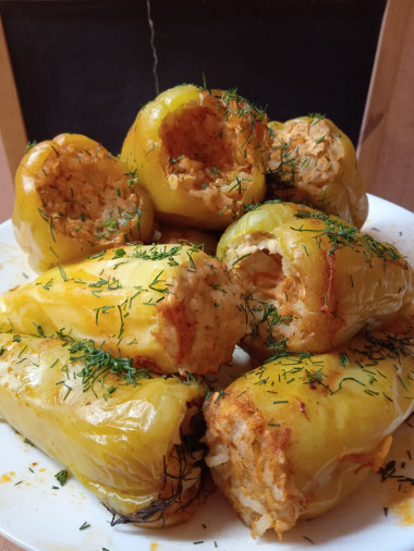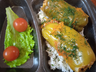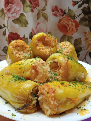 У меня, вот такие фаршированные перцы с рисом и овощами в духовке получились, жаль, что цвет, только один у перчиков, не хватает для разнообразия))