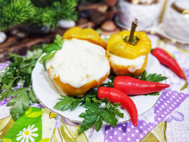 Очен мне понравился такой вариант перцев. Готовить быстро, потому что не надо отваривать перцы, а рис готовится сразу с овощами. Я боялась, что они не пропекутся без соуса, но зря, перцы отлично приготовились, были мягкими и вкусными. Думаю, что удобнее было бы начинить половинки перцев и запекать их лежа, тогда и сыра можно было бы больше насыпать сверху.