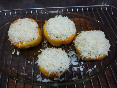 За пять минут до конца можете посыпать перцы сверху натертым сыром. Если вы готовите постное блюдо или придерживаетесь вегетрианской диеты, то исключите этот шаг. Я использовала моцареллу, но подойдет любой сыр, который хорошо плавится.