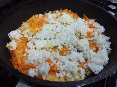 Рис промойте в нескольких водах, остатки воды хорошо слейте. Высыпьте рис на сковороду к овощам. Перемешайте продукты. Обжаривайте рис пару минут, помешивая.