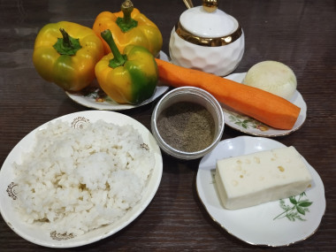 Как запечь перец фаршированный овощами и рисом в духовке? Подготовьте продукты. Перец возьмите среднего размера, чтобы он успел пропечься в духовке. Рис я взяла круглозерный, но вообще подойдет любой сорт, выбирайте по вкусу. Набор овощей также может быть любым, кроме или вместо предложенного мной подойдут помидоры, баклажаны, кабачки. Лук с морковью советую оставить — с ними начинка сочнее. Все овощи предварительно помойте и обсушите.