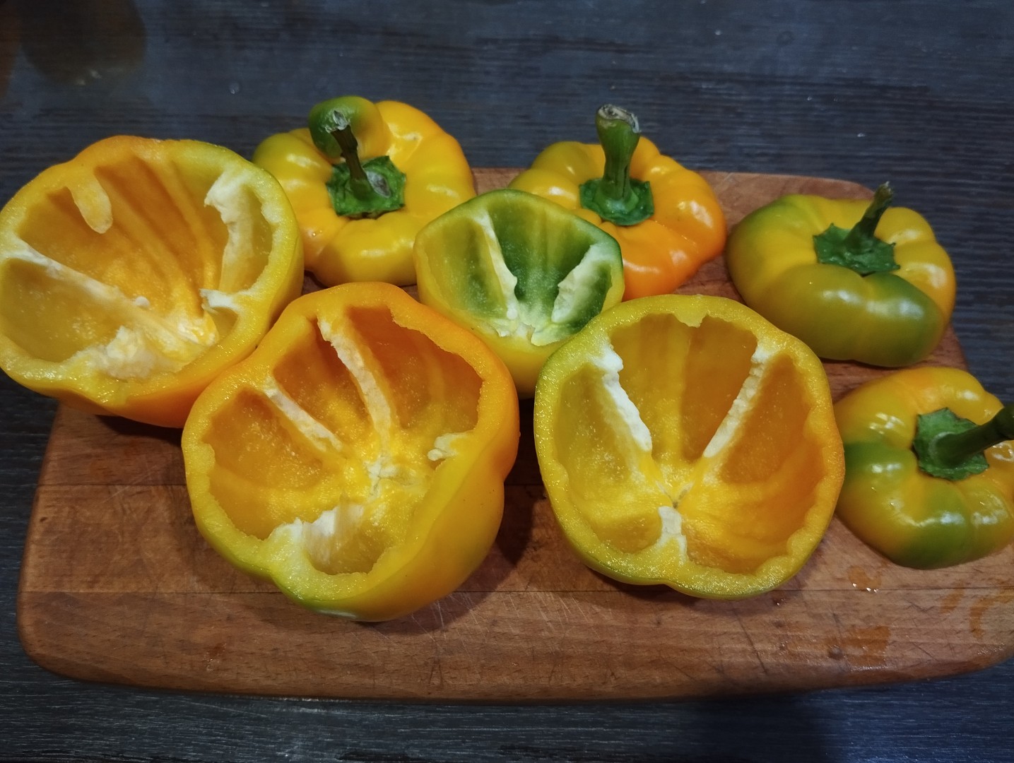 У перцев отрежьте хвостики вместе с частью мякоти, но не выбрасывайте их. Они будут исполнять роль крышечек. Серединку вместе с семенами удалите. Перец в этом рецепте предварительно не отваривается.