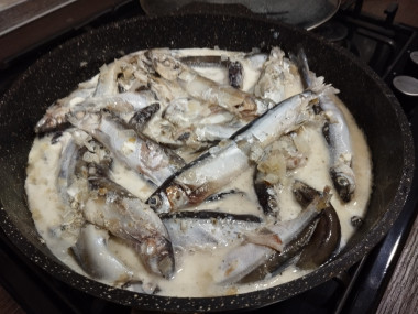 Лук мелко порезала и обжарила на сковороде. Добавила целую мойву,обжарила вместе с луком. Молоко смешала со сметаной, добавила соль,специи для рыбы. Залила соусом рыбу, аккуратно перемешала и протушила несколько минут.