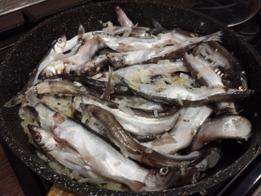 Затем выложите в сковороду мойву и обжаривайте её вместе с луком на небольшом огне 5-7 минут. Рыба готовится очень быстро.