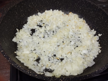 На горячую сковороду налейте немного растительного масла и обжарьте нарезанный лук 1-2 минуты до прозрачности.