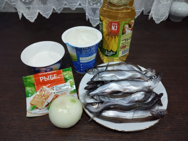 Как потушить мойву с луком на сковороде? Подготовьте для этого все необходимое. Если рыба заморожена, то заранее вытащите её из морозильной камеры, чтобы она разморозилась при комнатной температуре. Мойву помойте и обсушите. Чистить её не надо. Рыба достаточно маленькая, чистить её не удобно. И после чистки она просто развалится при готовке. Сметану и молоко можно использовать любой жирности. Чем больше будет жирность сметаны, тем гуще будет соус.