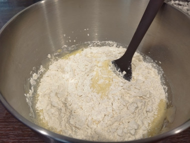 Муку просейте с разрыхлителем и добавьте в тесто. Аккуратно перемешивайте массу силиконовой лопаткой сверху вниз, стараясь, чтобы тесто не осело и разбивая все мучные комочки.