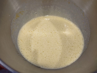 В миске взбейте миксером яйца с сахаром. Взбивайте до пышной устойчивой пены и полного растворения сахара. Смесь должна увеличиться в 3-4 раза. Но важно не перевзбить яйца: масса должна быть пышной и со множеством мелких воздушных пузырьков. Если вы будете взбивать слишком долго, до плотности, то ваш корж не поднимется при выпекании.