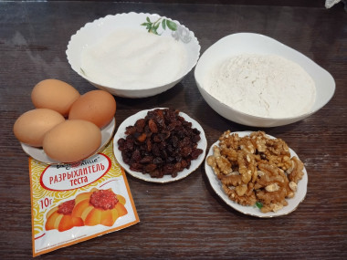 Как сделать печенье Мазурка с грецкими орехами и изюмом? Подготовьте необходимые ингредиенты. Муку берите высшего сорта. Яйца берите крупные отборные и свежие. Если яйца небольшие, возьмите на 1 больше. Яйца должны быть комнатной температуры, поэтому заранее выньте их из холодильника.