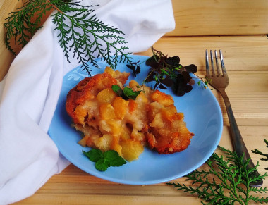 Выложите сверху персики. Так как у меня довольно большая форма, слой теста получился тонким, и персики не утонули в нем, а остались на верху. Советую взять форму поменьше для такого количества продуктов, тогда над персиками будет тесто.