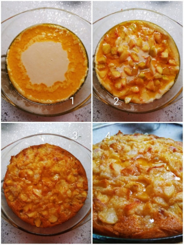 И сразу же, не дожидаясь, пока масло остынет, влейте в форму тесто. Масло окажется вверху, так и должно быть, оно сделает верх пирога красивым и ароматным. Перемешивать тесто с маслом не нужно.
