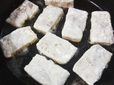 Сковороду нагрейте до горячего состояния и налейте на нее немного растительного масла. На горячую сковороду выложите рыбу в муке. Обжарьте её на сильном огне с двух сторон.