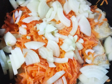 Отдельно очистите лук и морковь. Лук нарежьте, а морковь натрите на крупной терке.