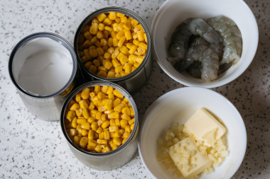 Как сварить кукурузный суп-пюре с креветками? Очень просто! Для начала подготовьте необходимые ингредиенты по списку. Мы используем консервированную кукурузу, но ее можно заменить на свежую или замороженную. Вес консервированной кукурузы указан в чистом виде без жидкости. Это 2 банки. Однако при этом может увеличиться время варки. Куриный бульон можно заменить на овощной или обычную воду. Оливковое масло можно заменить на другое растительное.