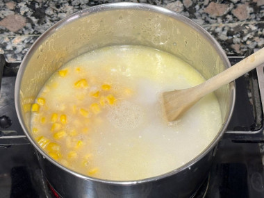 Добавьте в кастрюлю консервированную кукурузу. Влейте куриный или овощной бульон (или воду) и жирные сливки. Посолите суп по вкусу и перемешайте.