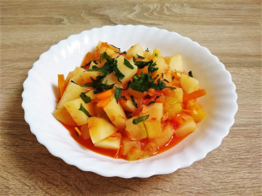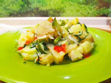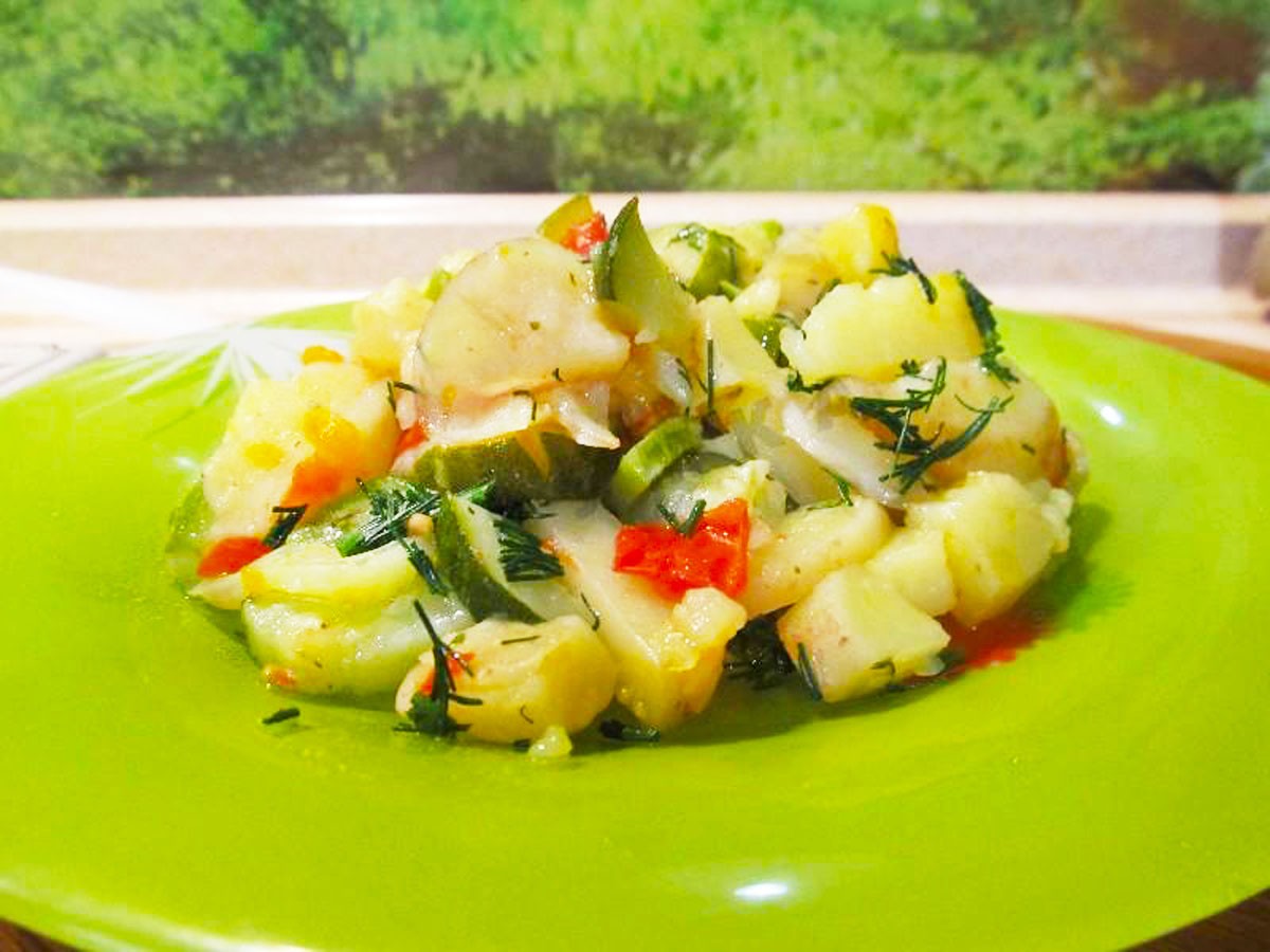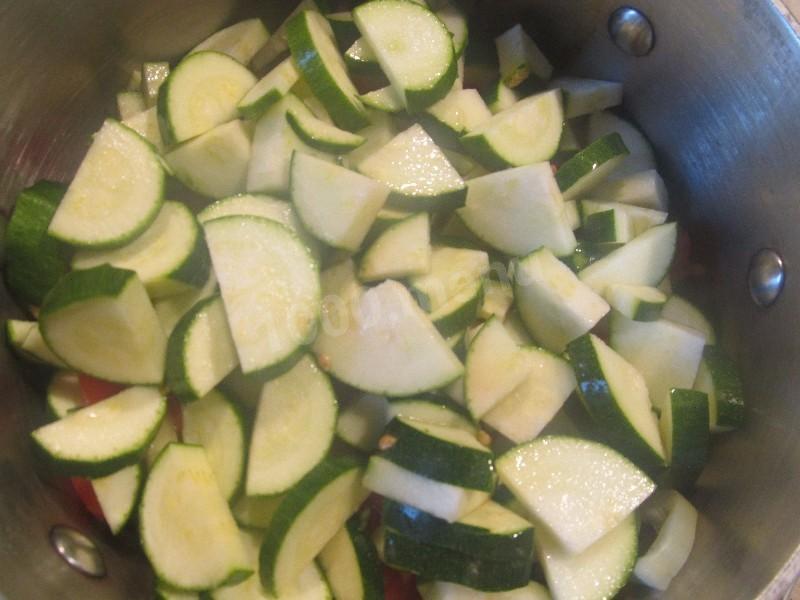 Кабачок помойте и нарежьте полукружочками или такой же по величине и толщине соломкой, как и картошку. Если кабачок не сильно молодой, то с него нужно предварительно снять кожицу и удалить семена. Тушите овощи под крышкой около 40 минут. Не перемешивайте.