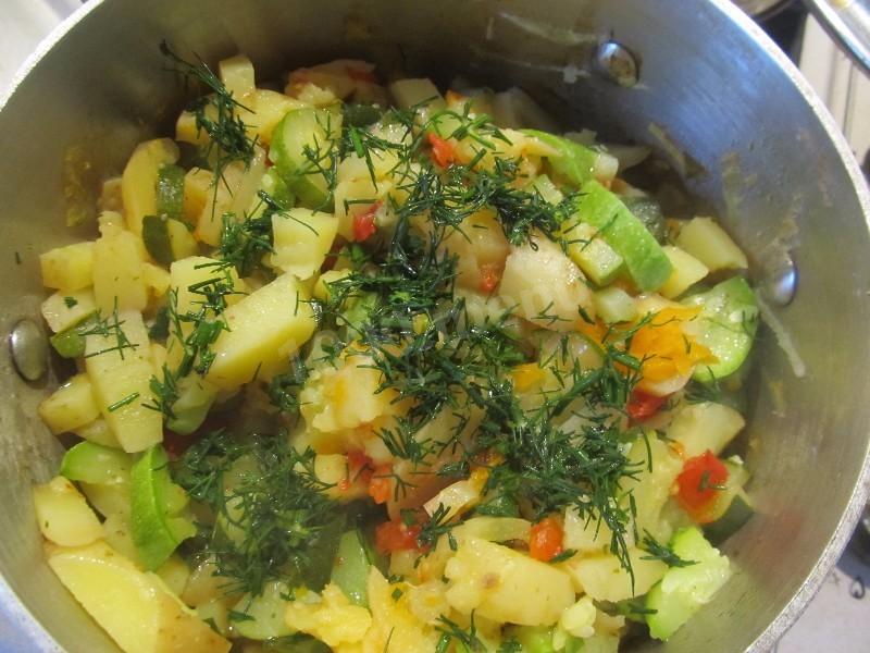Зелень помойте и обсушите бумажным полотенцем. Измельчите ножом укроп или любую другую зелень по вашему вкусу (петрушку, кинзу, базилик, зеленый лук). Сверху выложите зелень и только после этого аккуратно все перемешайте. Накройте снова кастрюлю крышкой и тушите ещё примерно 20 минут на умеренном огне.