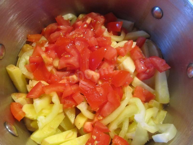 Болгарский перец очистите от семян и белых перегородок, помойте и нарежьте соломкой. Помидор помойте и нарежьте дольками средней величины. Отправьте овощи в кастрюлю с луком и морковкой. Томите всё вместе примерно 5-7 минут.
