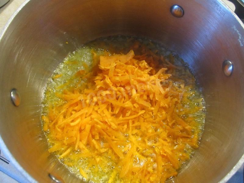 Добавьте нарезанную морковь в кастрюлю к луку и обжаривайте их вместе около 2-3 минут, периодически помешивая лопаткой, чтобы не пригорело.