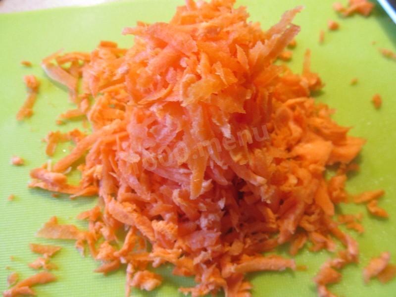 Морковь очистите, помойте, натрите на крупной терке или нарежьте небольшой соломкой. Имейте в виду, что от того, как вы измельчите морковь, зависит и конечный результат в этом блюде: натертая морковь в процессе термической обработки равномерно смешается с остальными ингредиентами, нарезанная соломкой или брусочками сохранит свою форму. Можете выбрать способ нарезки по своим предпочтениям. Всё о работе с тёркой можете прочитать в статье под шагами.