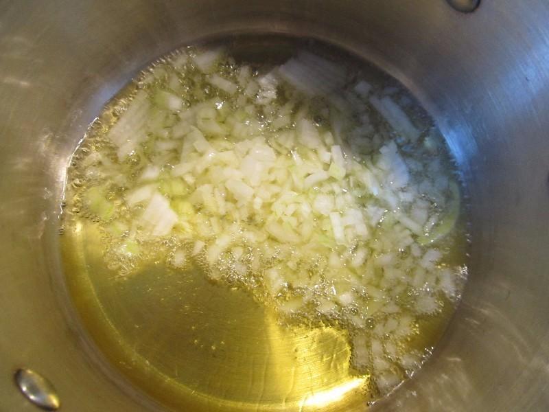 Лук очистите от шелухи, промойте и нарежьте кубиками. Добавьте порезанный кубиками лук и немножко припустите его до прозрачности на среднем огне. Чтобы при нарезке лука не раздражалась слизистая глаз, промойте луковицу и нож холодной водой. Разделочная доска не впитает неприятный луковый запах, если перед нарезкой натереть ее кусочком лимона.