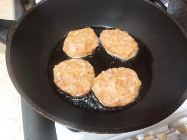 В сковородке разогрейте масло, выложите заготовки котлет и обжаривайте их с одной стороны по четыре-пять минут до золотистой корочки на среднем огне. Как выбрать сковороду и масло для жарки читайте в статьях в конце рецепта.