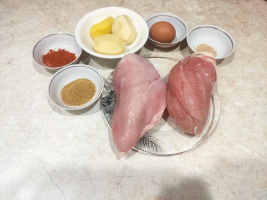 Куриное филе и картофель прокрутила через мясорубку. Добавила яйцо, соль,специи: приправу для курицы,молотый имбирь, копчёную паприку,перемешала и слегка отбила руками.