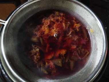 Получившуюся смесь протрите через сито вместе с жидкостью. В отвар всыпьте сахар и лимонный сок. Перемешайте. У меня варенье было сладким, поэтому я всыпала только две столовые ложки сахара. И добавила лимонный сок, чтобы уравновесить вкус готового киселя. Если у вас варенье кисловатое, например из лимона, можете добавить в отвар больше сахара, а вот лимонный сок вообще не добавлять. Ориентируйтесь на свой вкус и особенности варенья.