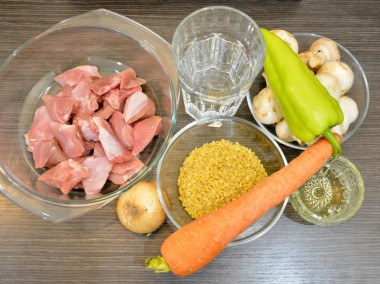 Калорийность продуктов: Индейка, Булгур, Лук репчатый, Морковь, Шампиньоны, Растительное масло, Вода, Соль, Перец черный молотый, Болгарский перец