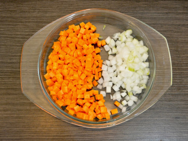 Очищенные лук и морковку нарежьте маленькими кубиками. Морковку можете натереть на крупной терке.