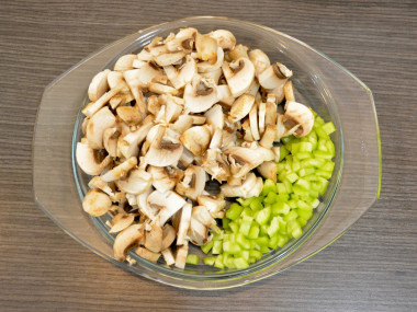 Шампиньоны промойте, разложите на бумажные полотенца и хорошо высушите, чтобы грибы не набрались влаги. Нарежьте на небольшие ломтики.
