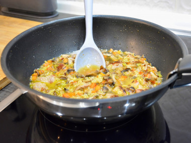 Также обжарьте грибы на разогретой сковороде примерно 3-5 минут. Время от времени помешивайте. Все обжаренные овощи и грибы отправьте на сковороду к мясу.